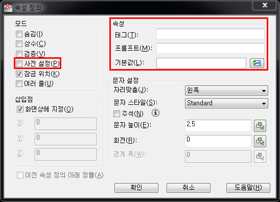 속성정의 창의 빨간 사각형 부분