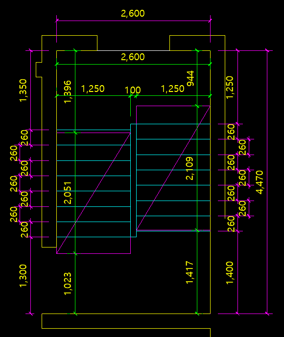 - 선홍색 치수선 → 계단 챌판(단높이) 이 놓이는 위치