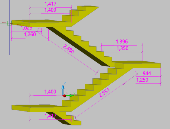 위의 평면도와 단면도를 기반으로 3D 모델링을 하면 아래와 같은 계단 형상이 나옵니다.